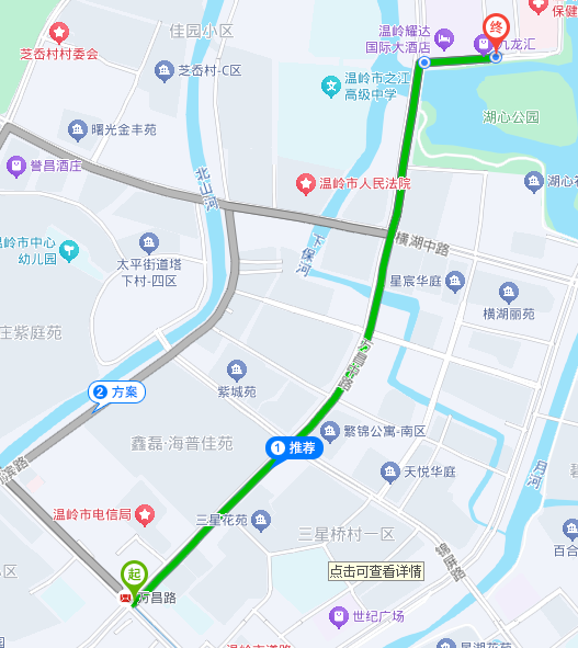路線規(guī)劃(1):步行至S1軌道交通溫嶺火車站站,萬昌路站下車。步行至購物中心北站公交站,乘坐19/13/9路公交車至交警大隊(duì)(總商會(huì))站。如圖一所示。