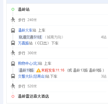 路線規(guī)劃(2):步行至S1軌道交通溫嶺火車站站,萬昌路站下車。出租車或網(wǎng)約車前往酒店(約2公里)。如圖二所示。